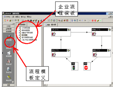 在Javelin的"系統(tǒng)管理"工具條中有一個流程模板定義入口,在這里你可以創(chuàng)建企業(yè)的各種各樣的流程模板,見下圖所示: