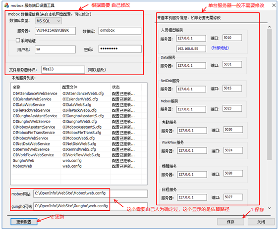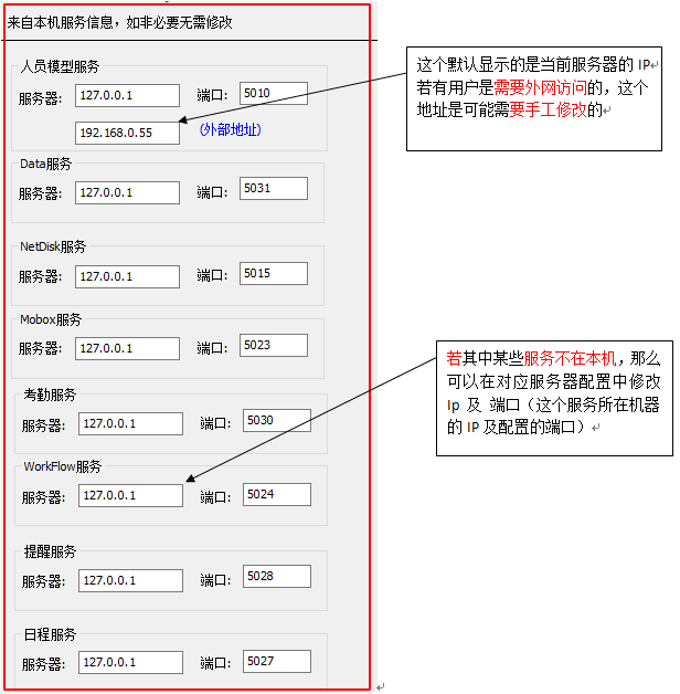 這個(gè)里面的數(shù)據(jù)來(lái)自對(duì)本機(jī)已經(jīng)部署服務(wù)的信息獲取。一般這些是不需要修改的(除了人員服務(wù)的外部地址)。但若存在某些服務(wù)不在本機(jī)的情況,可以對(duì)該服務(wù)的IP及端口進(jìn)行調(diào)整。調(diào)整會(huì)更新該服務(wù)涉及的所有相關(guān)配置