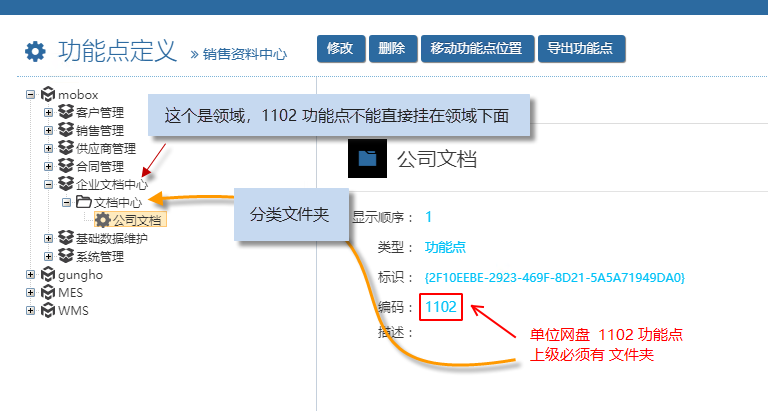 在設置的Mobox文檔中心的時候,功能點不能直接掛到領域下面,而必須在領域下面先建立分類文件夾,之后才能掛接這2個功能點。
