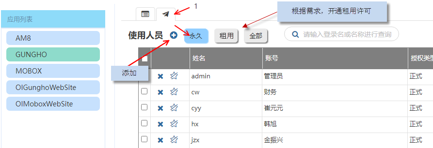 在一個(gè)授權(quán)中包含了2類授權(quán)模式,永久許可企業(yè)一般可以設(shè)置經(jīng)常使用這系統(tǒng)用戶(主要用戶)租用許可可以給那些平時(shí)不怎么用(可能一年就用 2,3次的用戶)