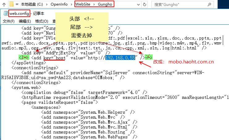 打開網(wǎng)站程序路徑? \OpenInfo\WebSite\Gungho\web.config? ?,具體看自己安裝路徑