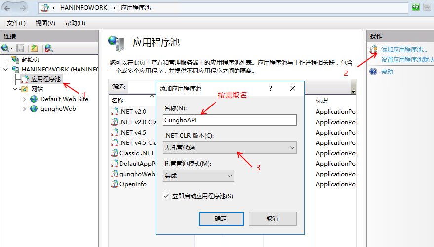 3、在 IIS 管理器中創(chuàng)建一個應(yīng)用程序池,并將其設(shè)置為使用無托管代碼。