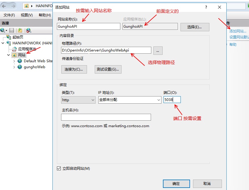 5、在 IIS 管理器中創(chuàng)建一個新的網(wǎng)站或?qū)?yīng)用程序發(fā)布到現(xiàn)有的物理路徑。
