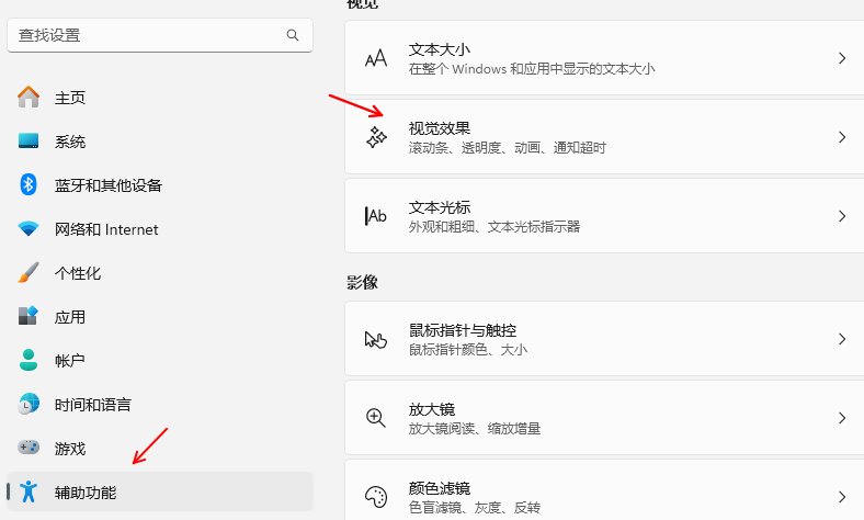左側(cè)菜單選擇“輔助功能”,右側(cè)選項(xiàng)中找到“視覺(jué)效果”,通過(guò)關(guān)閉透明效果和動(dòng)畫效果,你可以減少系統(tǒng)的視覺(jué)負(fù)擔(dān),提高電腦的響應(yīng)速度和流暢度。