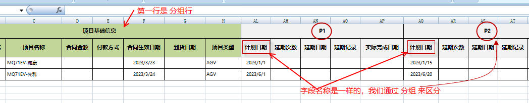 我們可以看到,excel第一行是分組行(項(xiàng)目基礎(chǔ)信息,P1,P2)