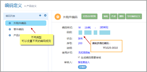 編碼定義即編碼規(guī)則定義,在該功能中可以定義某種編碼的組成規(guī)則,編碼由各種類型的碼段組成,碼段有長度和顯示順序及相互之間的關(guān)系。在編碼定義中可以設(shè)置編碼由哪些碼段組成?確定碼段的順序、碼段的長度、碼段之間的關(guān)系等信息,設(shè)置編碼的允許使用范圍,比如設(shè)置某一個(gè)編碼只允許某些人員、角色、部門能使用,也可以設(shè)置在申請編碼時(shí)是否需要有人審核,由誰審核? 可以有效對編碼的使用進(jìn)行管理。