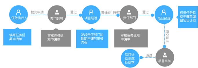 復(fù)雜計劃變更流程是一個比較嚴(yán)謹(jǐn)?shù)挠媱澴兏^程,首先計劃的變更肯定是由某一個任務(wù)或多個任務(wù)的延期造成計劃無法滿足預(yù)期,需要變更。因此,首先任務(wù)的執(zhí)行人提出任務(wù)延期申請,并說明原因、指出造成延期的責(zé)任部門,要求延期多少天。這些申請首先會到執(zhí)行人所在的部門,得到部門負(fù)責(zé)人的認(rèn)可,然后這些申請才會到項目經(jīng)理。由項目經(jīng)理發(fā)起多部門的延期任務(wù)申請確認(rèn),通過后由項目經(jīng)理根據(jù)任務(wù)延期申請單里的信息改進(jìn)項目計劃,然后走審核流程通過后項目計劃變更完成