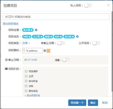 項目名稱、項目內(nèi)容描述、項目周期、項目經(jīng)理、項目成員、項目階段、項目內(nèi)權(quán)限配置、項目內(nèi)相關(guān)審核流程配置等。設(shè)置好后,保存后項目建立。項目成立后系統(tǒng)會通過我們的企業(yè)內(nèi)部通訊系統(tǒng)項項目成員發(fā)送消息進(jìn)行提醒。